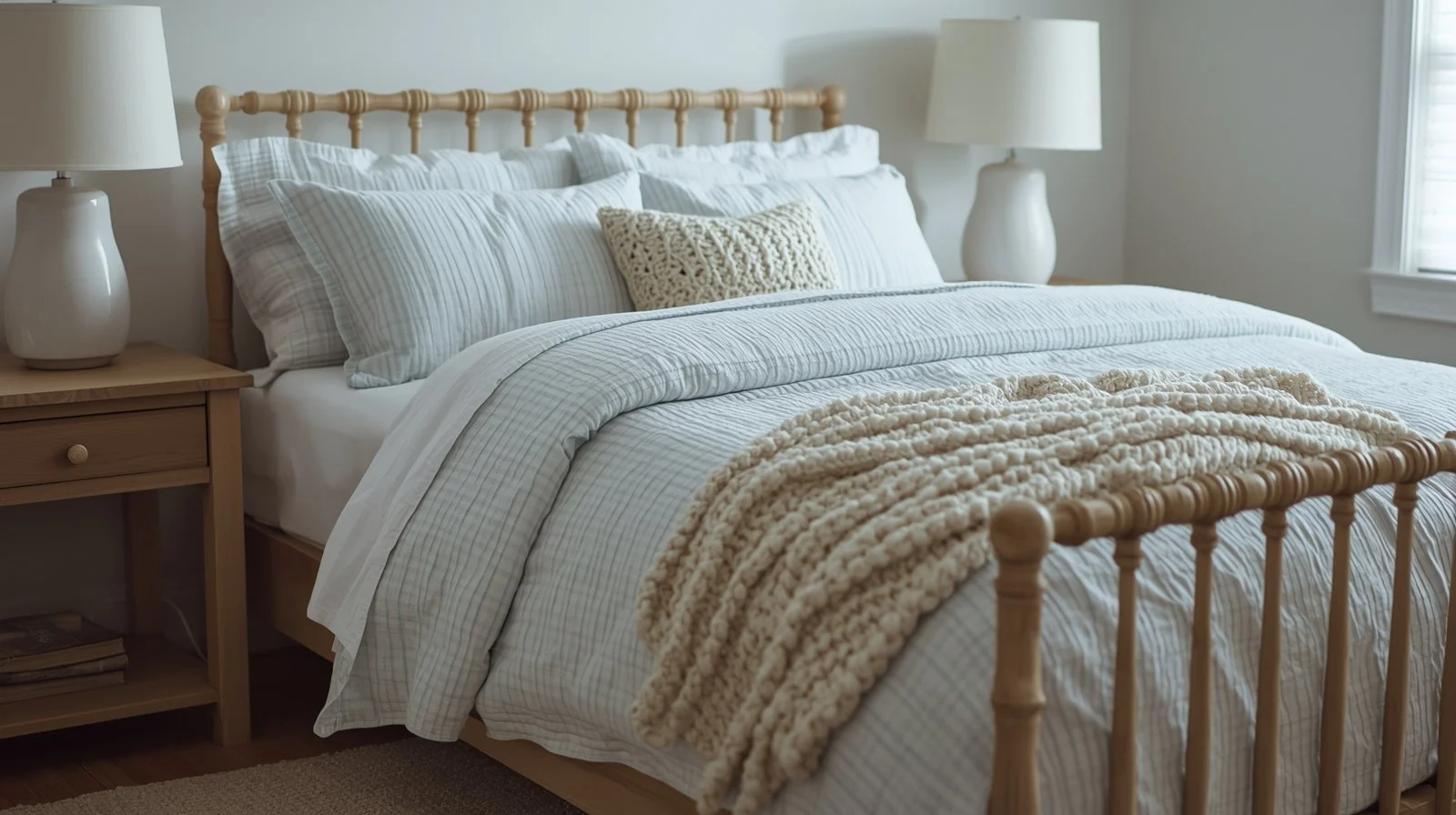 Layer with white sheets, soft blue quilts, ticking stripes, chambray pillows, and a knitted throw for depth.