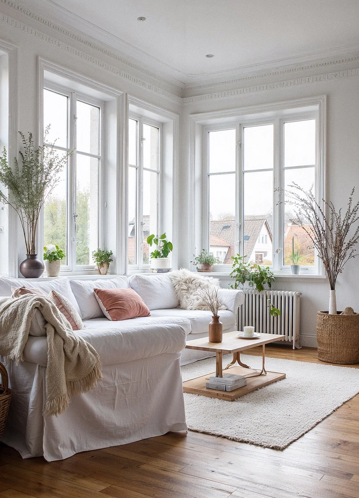 Light is treated as a design element in itself. Large windows are often left bare or draped in soft sheers, allowing daylight to fill the space. Pale walls reflect this light, creating a sense of openness and calm.