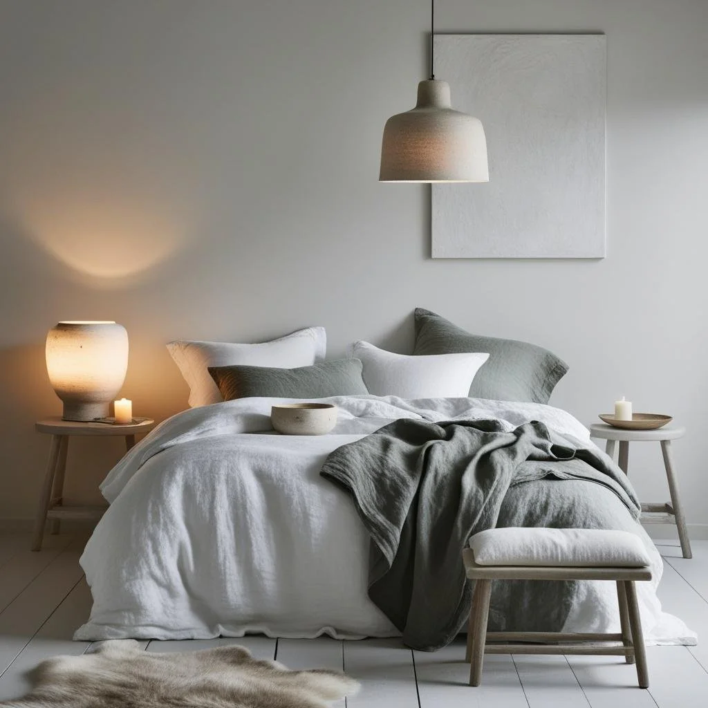 Use layers of linen in whites, stone greys, or sage. Keep bedside tables minimal—just a book, a candle, a small dish. Hang one large piece of art or leave the wall bare. A bench at the foot of the bed or a sheepskin rug brings a sense of ritual and softness.