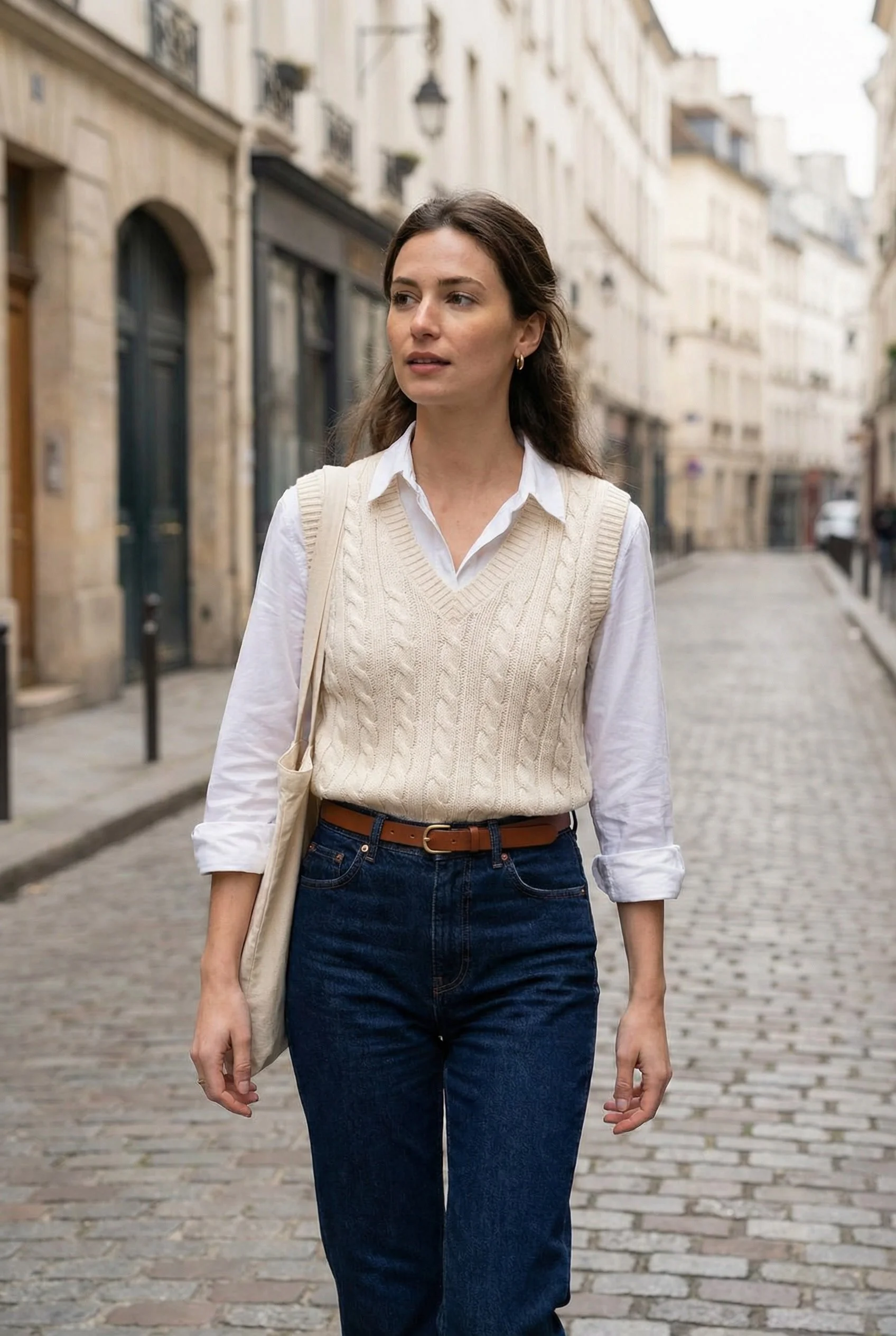 Button-Down + Knit Layer + Denim + Minimal Belt